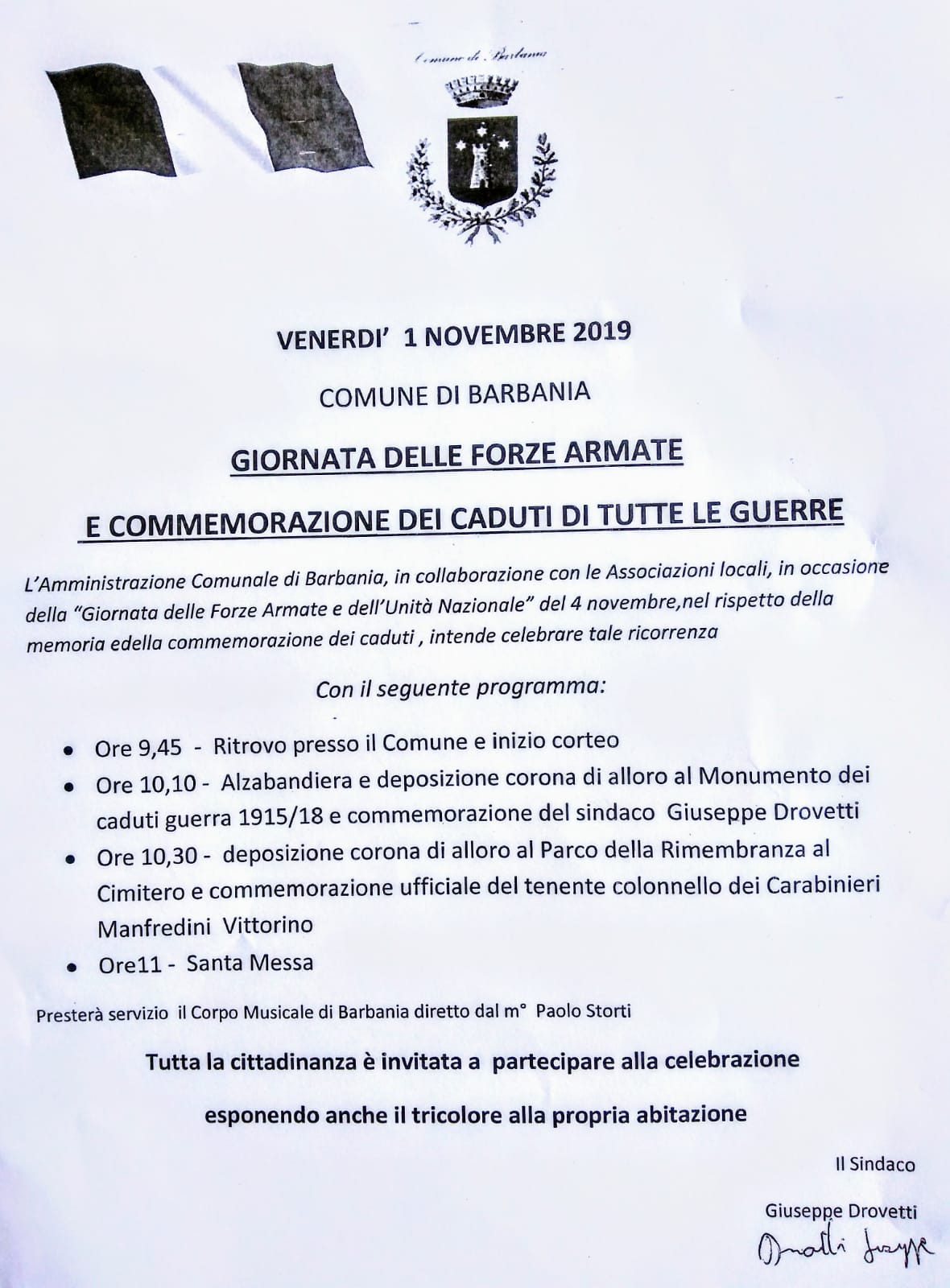 L'Amministrazione Comunale di Barbania, in collaborazione con le Associazioni locali, in occasione della "GIORNATA DELLE FORZE ARMATE E DELL'UNITA' D'ITALIA" del 4 novembre, nel rispetto della memoria e della commemorazione dei caduti, intende celebrare tale ricorrenza: