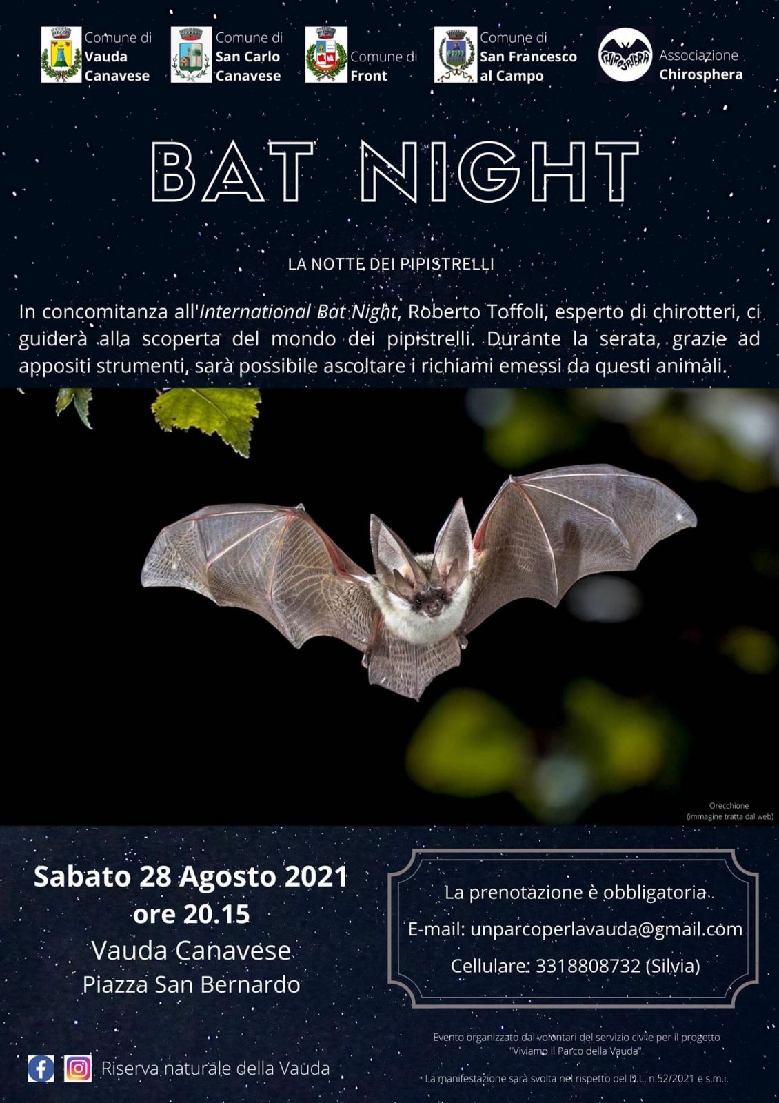 L'evento si svolgerà Sabato 28 agosto 2021 presso Piazza San Bernardo (di fronte al comune di Vauda Canavese). Sarà presente Roberto Toffoli, un esperto chirotterologo (ricercatore che si occupa di pipistrelli), che ci parlerà di questi animali e ci permetterà di ascoltare i loro richiami attraverso l'utilizzo di appositi strumenti.