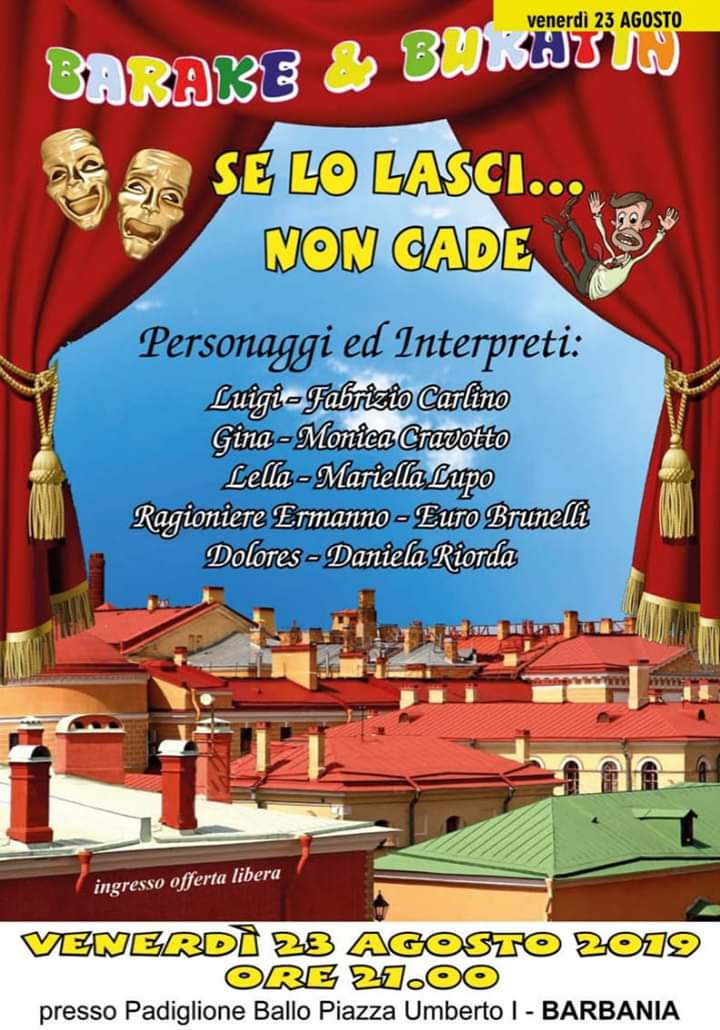A partire dalle ore 21.00 presso il Padiglione di Piazza Umberto I, avrà luogo la commedia esilerante interpretata dalla compagnia BARAKE & BURATIN: